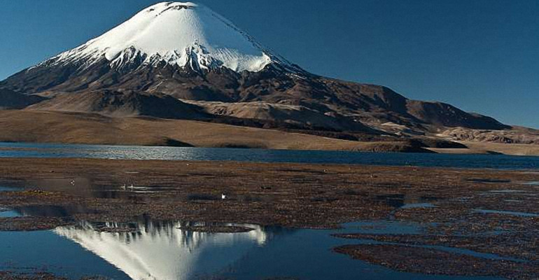 Perfect symmetry and a 6,348-metre summit make Parinacota, on the border with Bolivia, one of the most beautiful volcanoes in South America. The cone rises above Lake Chungara inside Lauca National Park in northern Chile and forms one half of the famous twin Payachata volcanoes.