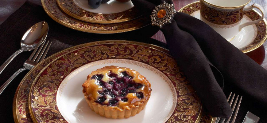 This bone china pattern is one of the louder varieties in the category. A rich red border runs along the rim featuring a leafy pattern in golden yellow. The design is suggestive of the autumn season with a gold rim running around its edge. The heavy colored dinnerware is ideal for extravagant dinners or a china hutch cabinet.