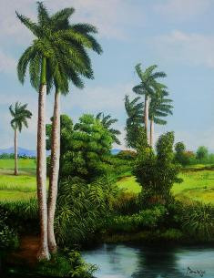 The subjects of his paintings are common Caribbean lifestyle scenes from his hometown where he lives till today. He has had individual as well as combined exhibitions all over Cuba and is a celebrated Cuban landscape artist.