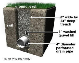 On of the most important parts of installing a French drain system is identifying a suitable spot for the water to drain into. If you do not get this part right, the whole point of the French drain will be futile as the water will have nowhere to drain to. This difficulty can be overcome if there is a natural drain in the area; the main drain of the system could be laid to flow into this drain. This is possible if the tract of land involved is in an open area like in the country side. The locating of the outlet becomes more complicated if the land is surrounded by neighboring properties or when it is situated in a township as this will involve very careful planning. In this case the planning, design and construction of the French Drain System is best left to professional agencies.