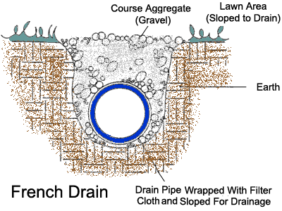 A characteristic of French Drain Systems for draining a relatively large squelchy backyard involves a network of trenches. That water will take the course of least resistance is a well known fact, and this characteristic of water is utilized to drain water. The trenches are filled with gravel that allows easy passage of water through it. Gravel generally refers a naturally occurring variety of soil that is granular in nature and extremely porous, i.e., there are a lot of gaps between the constituent granules that will allow water to pass through without difficulty. In some cases where this gravel is not readily available then hard granite broken stone of small size is utilized.