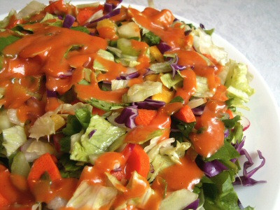 In the US the zesty French dressing ingredients turn the dressing into a reddish orange color and it is never pale white or bright and deep red. This is a pureed and uniform sauce that has a tangy sweet flavor. There are no pieces of herbs and spices floating in the smooth puree. The US vinaigrette includes ingredients like vinegar, ketchup, any vegetable oil, tomato puree, paprika, water, spices and sugar or honey which are all blended to a smooth and viscous paste.