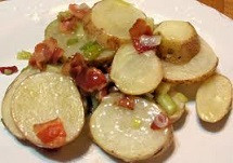 Use 5 pounds of red potatoes, which are very soft and not as dry out . Cook and peel them and set them aside to cool down. Boil six eggs and cut them into chunks. Fry the meat slices until crispy and then scrunch it up in paper towels to drain the oil. Break it up to small pieces. Mix the meat, potatoes and eggs in a bowl. In a separate bowl whip up one 8 ounce container of sour cream with 2 tablespoons of mayonnaise and season it with salt and pepper according to your taste. Blend this into the potato mixture with a fork and mash up the potatoes slightly. Place it in the refrigerator for the flavors to blend in before you serve it over barbecued steaks.