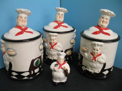 Italian chef canisters have various styles as well. Some Italian chef canisters have hand painted drawings of Italian chef on them. Some Italian chefs are carrying a canister on their back. Others are standing tall with spread arms offering a canister in front of them. Some canisters have vegetable drawings on them and they have Italian chef heads as handles on the top. So, you have a vast choice.