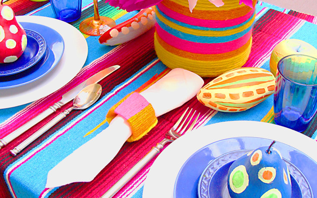 Every culture takes pride in their food, and presentation plays an important role in how the food is served. Table decorations with traditional Mexican styles in mind can include zerape blankets and papel picado. Zerape blankets are woven shawls that have a distinctive stripy pattern on them that is very vibrant. They are usually made of cotton, with fringed ends, and are often long and rectangular, perfect for a table runner. They can also withstand the heat of hot pots and pans, which is very handy for large self-serve dinner parties. Papel picado is the art of paper cutting, and whilst the finished panels are usually made for hanging in windows, they can also be used as placemats or coasters using thicker paper or plastic. They are readily available to order online, and can be custom made to suit the occasion. Modern cut-out felt placemats and coasters also have the papel picado look, if you are looking for an alternative.