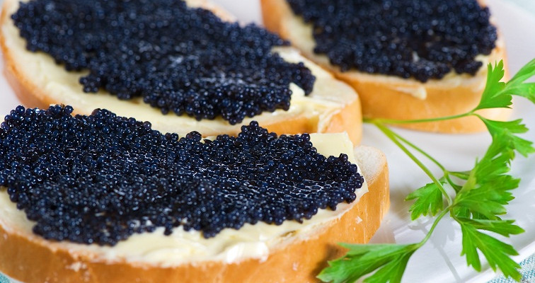 Caviar is predominantly taken from four varieties of sturgeon namely beluga, sevruga, sterlet and osetra, though salmon, tuna and lumpfish are also a source of caviar these days. Beluga caviar is found mainly in the Caspian Sea and is larger compared to other black caviar, ranging from black color to light grey. It has a smooth butter-like flavor. Sevruga roe is the smallest, mostly commonly found row, with a unique flavor comprising a natural salty taste.