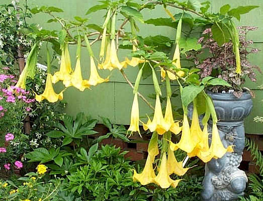 The Angels Spanish Fork (also known as the Angels trumpet) has an astounding growth rate and is a sprawling herbaceous perennial plant. Its stunning pale lavender or white flowers are shaped like trumpets.
